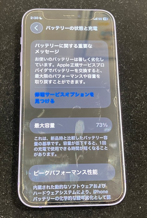 点検したところバッテリー最大容量は【73%】まで低下しており、交換が必要な状態でした。