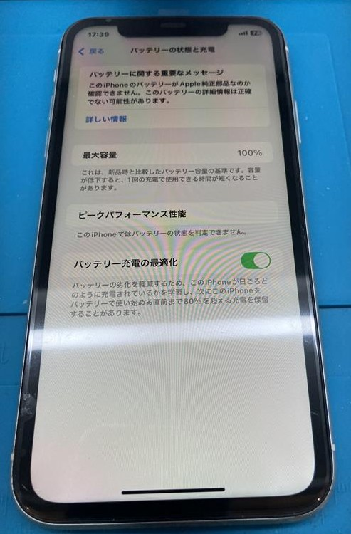修理後は画面表示が鮮明になり、バッテリー最大容量も100%に改善。動作試験も問題なく完了しました。