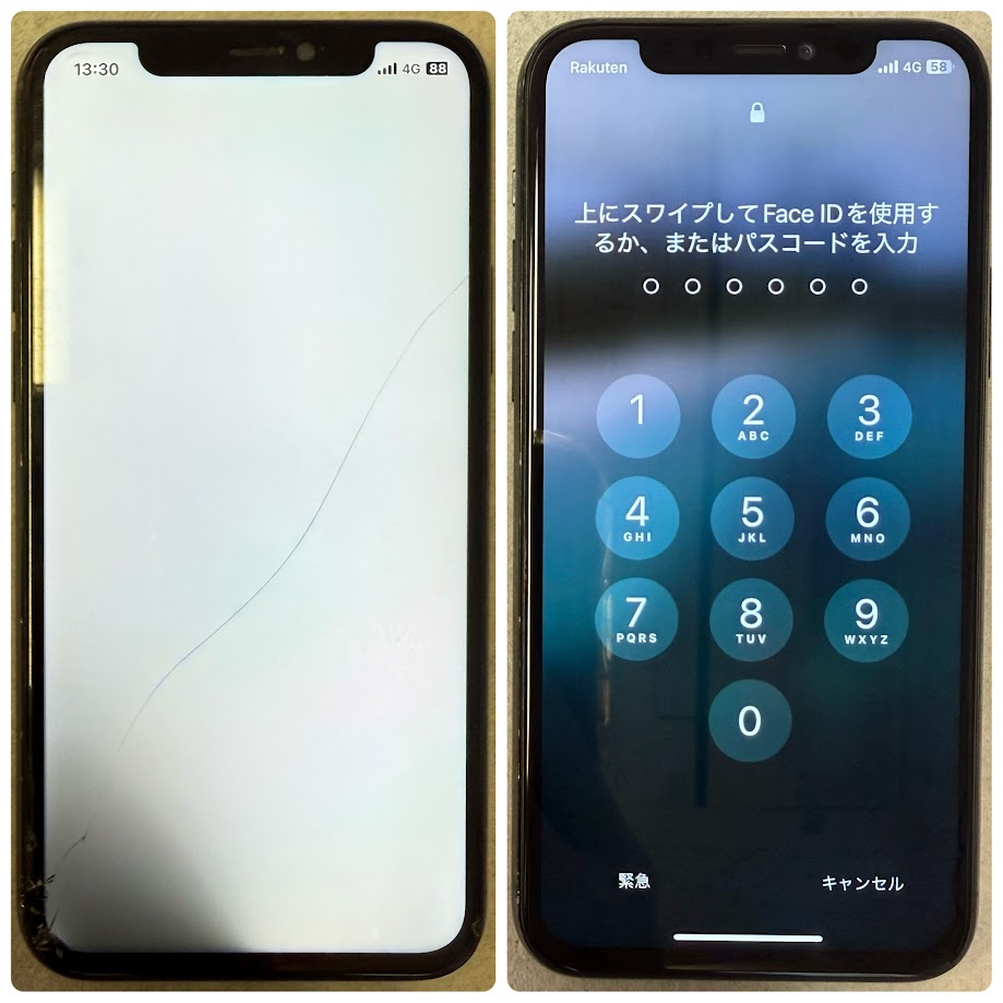iPhone11Proは有機ELディスプレイを採用しているため、衝撃によって液晶表示不良(ホワイトアウトやタッチ不良)が発生するケースが多くあります。今回も内部のディスプレイが破損しており、液晶交換修理で無事に改善いたしました。