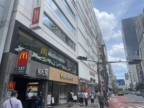 ビックカメラの方向に進むとマクドナルド、ビックカメラ、ヤマダ電機と店舗が続きます。そのまま道なりにお進みください。