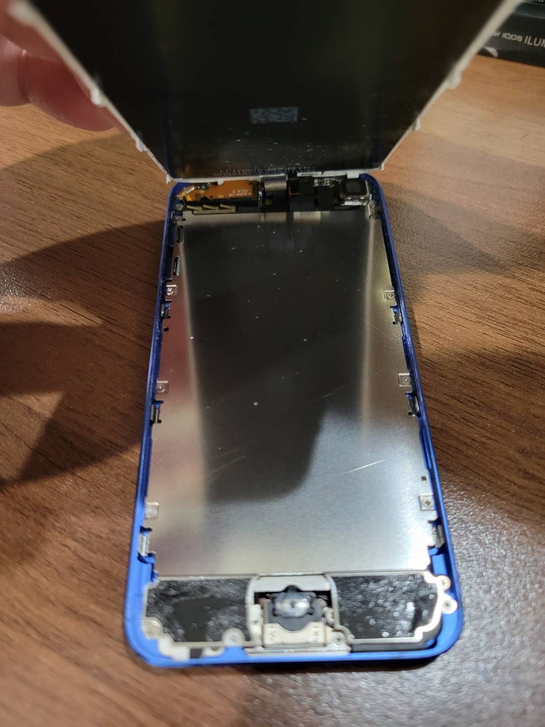 元のバッテリーの粘着シールをしっかり剥がし、新しいシールが背面充電に触れないよう丁寧にバッテリー交換いたしました♪