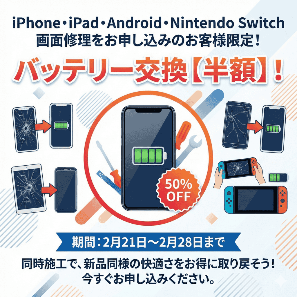 【2月28日まで!】画面修理ご依頼でバッテリー交換が半額!!