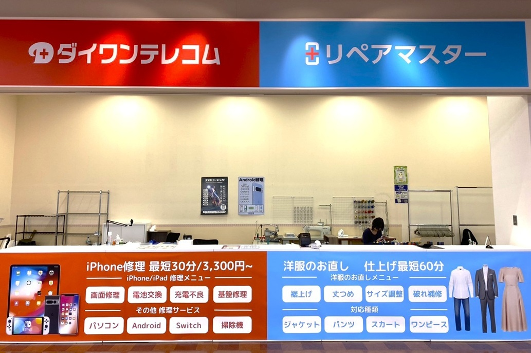 ショッピングモール内店舗のため、天候を気にせずご来店いただけるのもメリットの一つ。「できるだけ早く直したい」「買い物のついでに修理を済ませたい」というお客様は、ぜひガーデンモール木津川店までお気軽にご相談ください。
