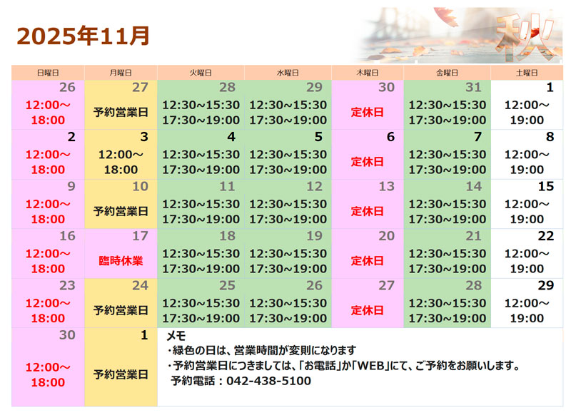 田無エリア店:11月の営業時間のご案内