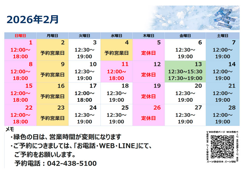 田無エリア店:2月の営業時間のご案内