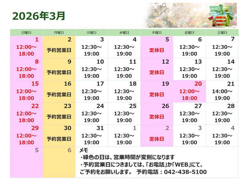 田無エリア店:3月の営業時間のご案内
