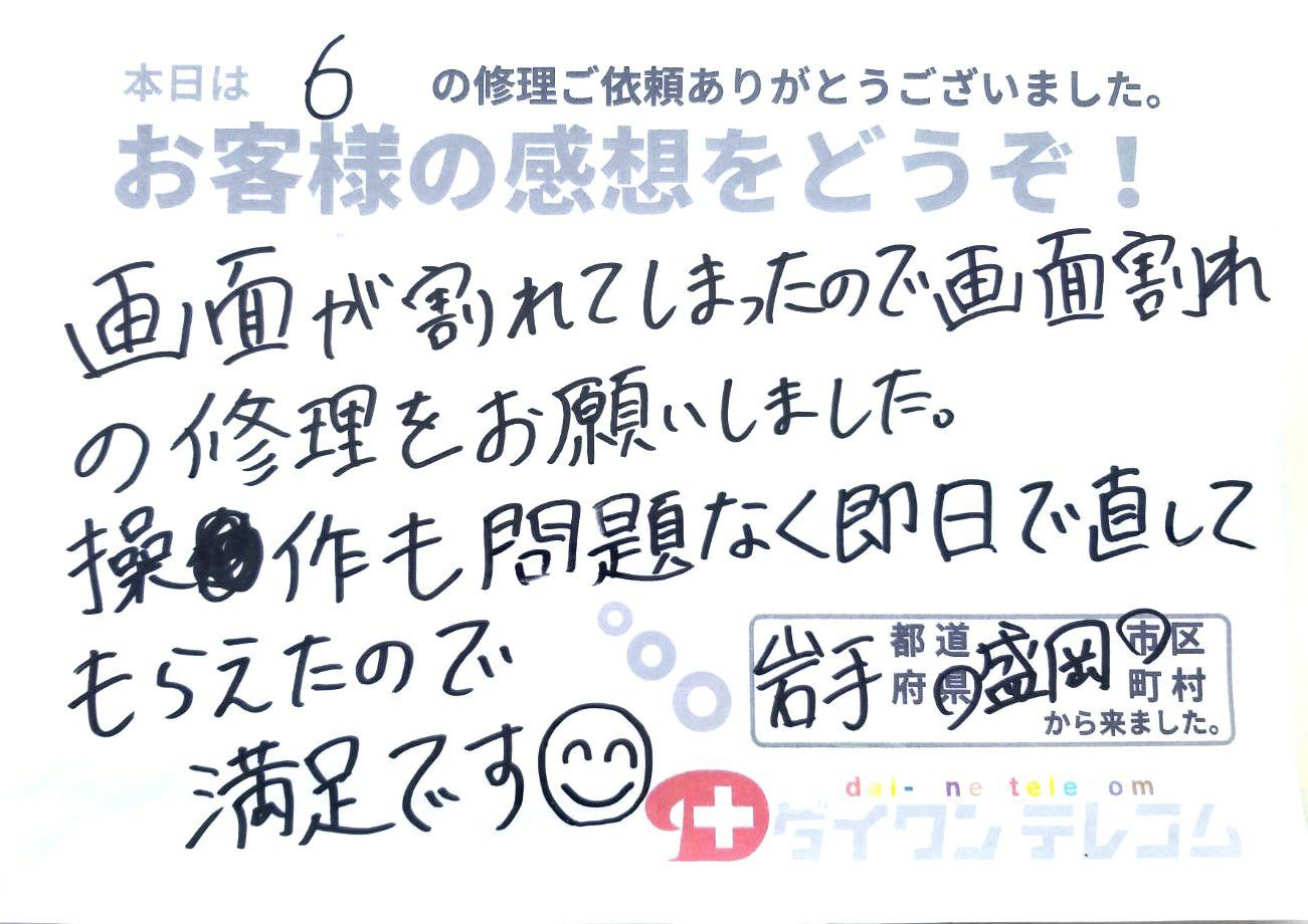 盛岡店からの返信この度はダイワンテレコム盛岡店をご利用いただき、誠にありがとうございました。今回は、画面を割ってしまわれたということで、画面の交換修理をいたしました。当店では修理前に動作確認を行いお客様の機器の状態をチェックし、修理が完了する前にも、交換したパーツの動作確認を行います。そしてお客様にお渡しの際には、お客様と一緒に最後の確認を行います。どうぞご安心してお任せください! 当店では、画面修理の他にも、バッテリー交換やカメラの修理などにも対応しております。機会がありましたら、是非お気軽にお立ち寄りください。